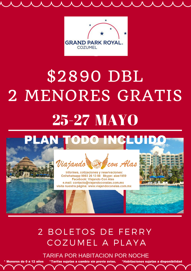 GRAND PARK ROYAL COZUMEL 17 May 2018 on Cozumel, Promociones, Puentes Vacacionales, Bloqueos 2 MENORES GRATIS de 0 a 12 años 2 BOLETOS DE FERRY CRUCE DE COZUMEL A PLAYA DEL CARMEN