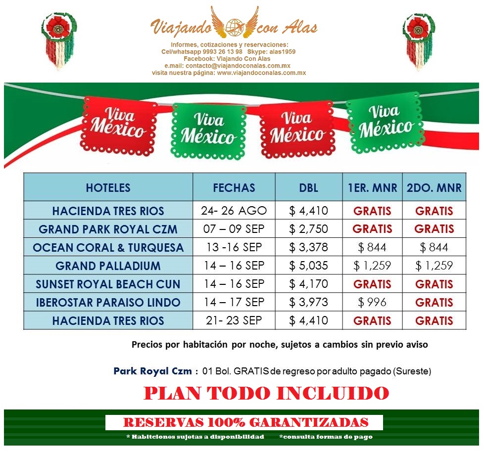 PROMOCIONES DE FIESTAS PATRIAS Y MAS 17 July 2018 on Cancún, Cozumel, Riviera Maya, Bloqueos, Puentes Vacacionales, Promociones Cancún, Riviera Maya, Cozumel MENORES GRATIS