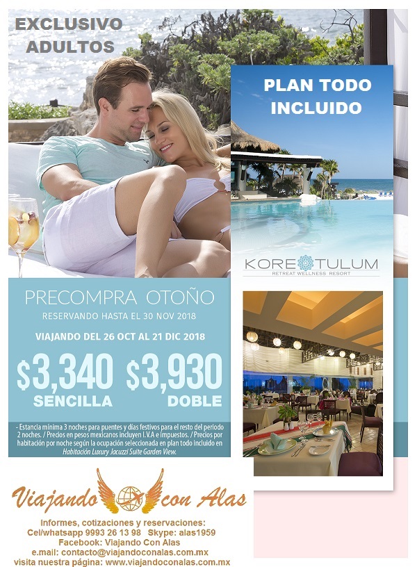- Precios por habitación por noche según la ocupación seleccionada en plan todo incluido. -Periodo para reservar hasta el 30 de noviembre del 2018