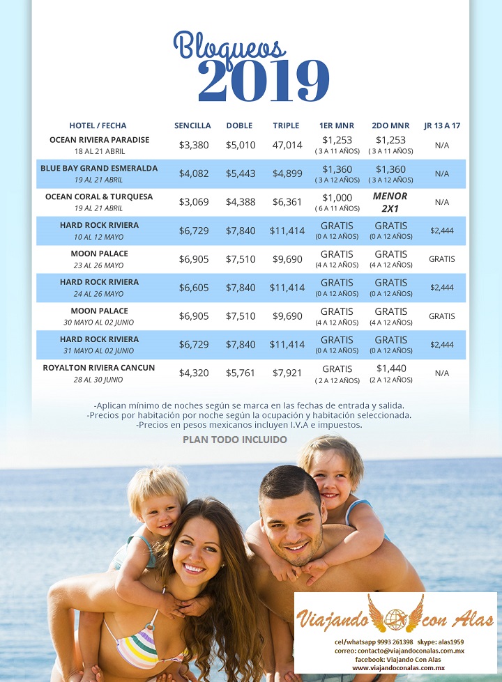 • Precios en pesos mexicanos, en plan todo incluido, incluyen IVA e impuestos