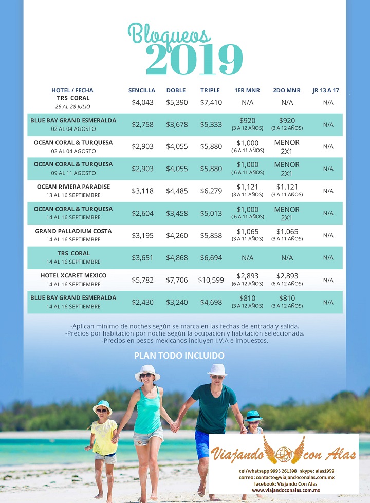 - Precios en pesos mexicanos, en plan todo incluido, incluyen IVA e impuestos