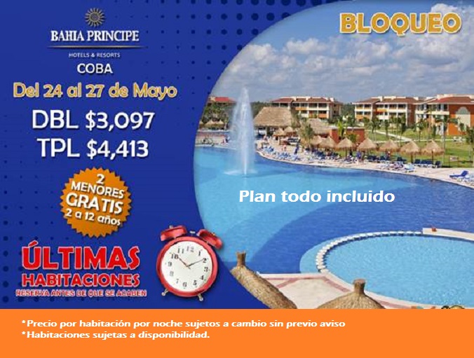 BAHIA PRINCIPE COBA CON 2 MENORES GRATIS!! 20 May 2019 on Bloqueos, Promociones, Riviera Maya, Playa Del Carmen, Cancún ULTIMAS HABITACIONES PARA VIAJAR DEL 24 AL 27 DE MAYO'19