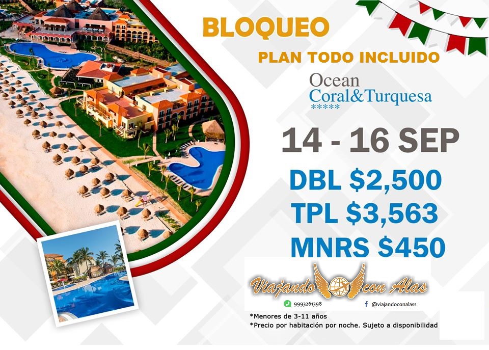 OCEAN CORAL & TURQUESA Riviera Maya 5* 16 July 2020 on Promociones, Riviera Maya, Bloqueos, Nacional, bl FIESTAS PATRIAS del 14 al 16 de septiembre 2020 Contacto: https://api.whatsapp.com/send?phone=529993261398&text=InfopromofiestaspatriasoceancoralRCDbloq Cotiza y Reserva por whats al 9993261398 Correo: contacto@viajandoconalas.com.mx Síguenos en Facebook: @viajandoconalass Síguenos en Instagram: @conalasviajando *Precios por habitación por noche sujetos a cambio sin previo aviso *Habitaciones sujetas a disponibilidad